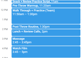 2. “(Team)” in the screengrabs of my schedule means mandatory meeting/practice. If not parenthesized with “(Team)” then I am personally scheduling that activity.