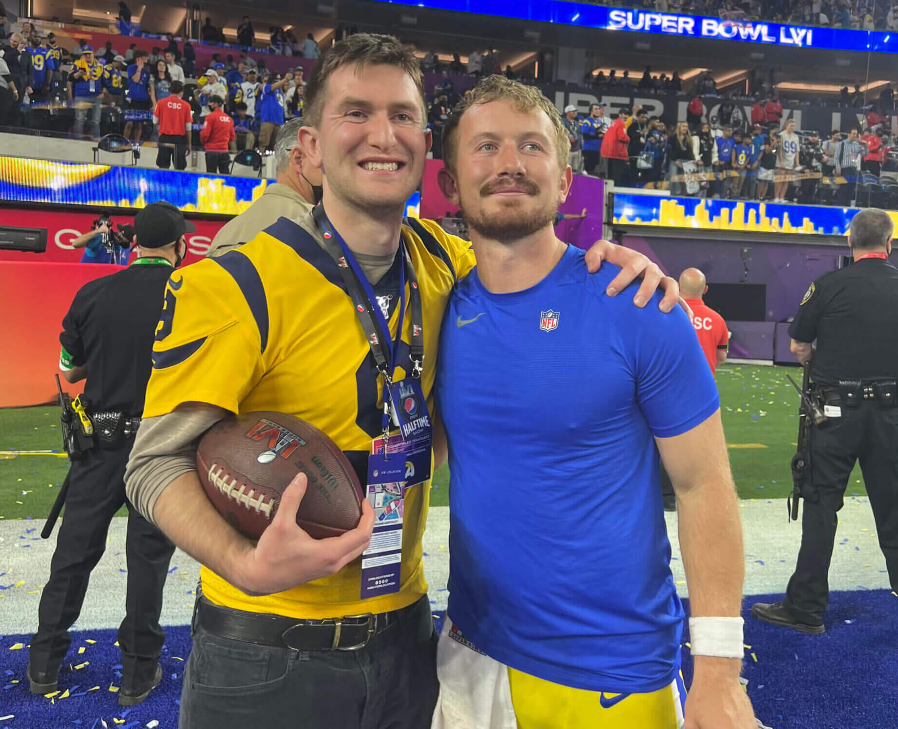 Bus to game: Blue and red lights flashing, with fans lined up everywhere, we ride the heavily guarded bus from Manhattan Beach to Inglewood. Normally I drive to the games (since the Super Bowl is in SoFi Stadium, our home field), but for security reasons that is not permitted today.